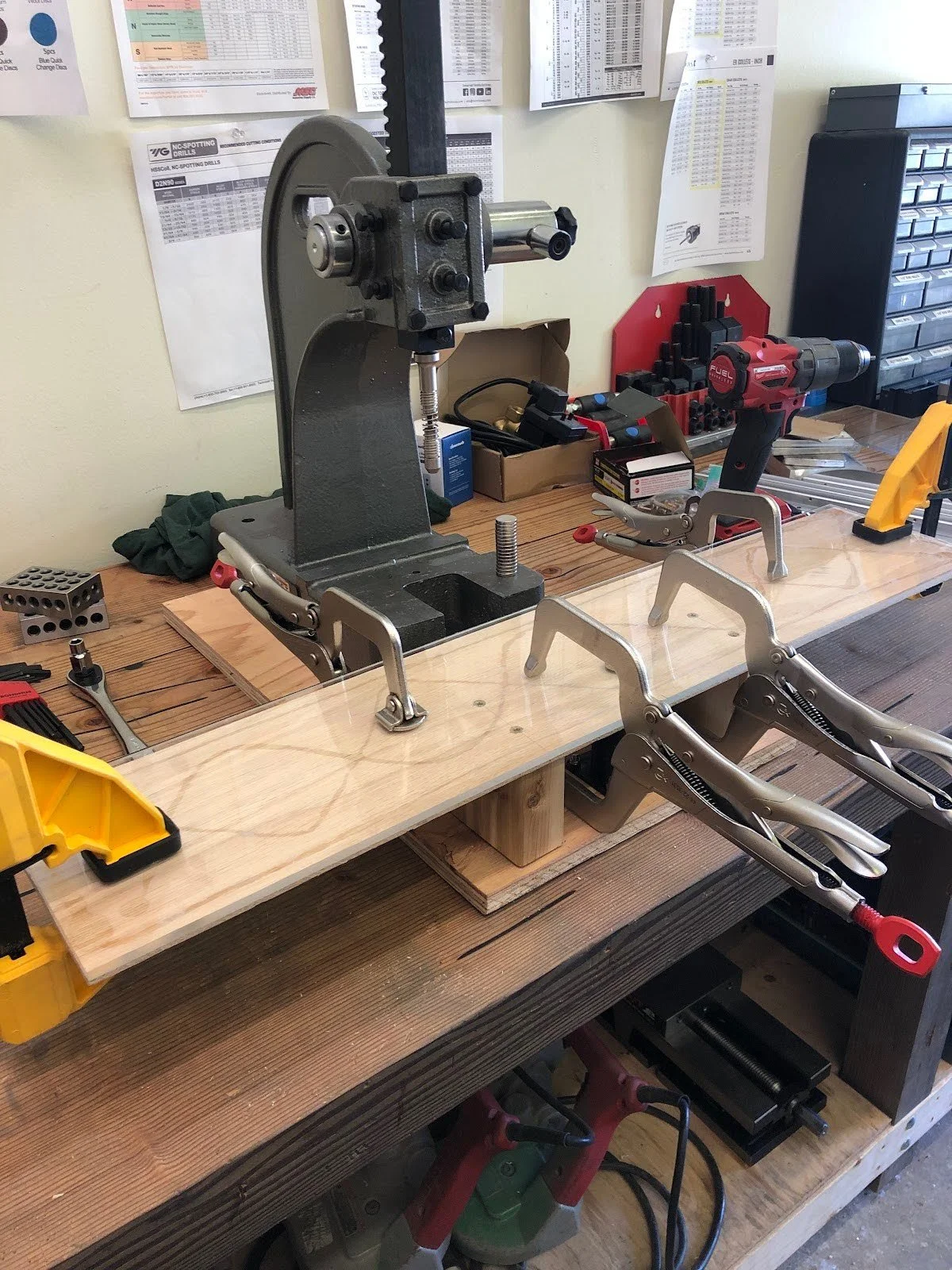 After this research, I solved the first problem of having to remove the skate from the press between each pin by creating a wooden plate that the press set into, creating a large operating workspace that fully supported the length of the skate and located the pinning tool above the operating area.