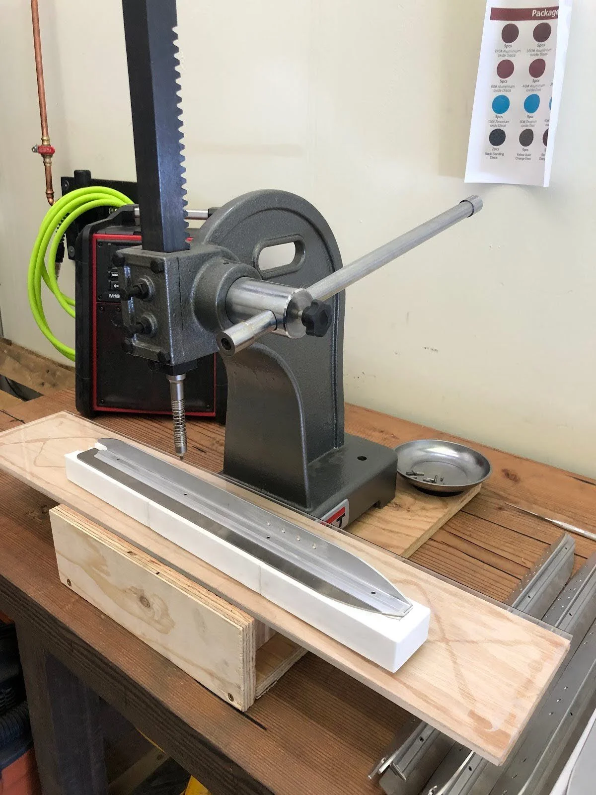 Objective: Samson Shepherd creates Nordic Skates in his company, Arctic Manufacturing Services LLC. His current manufacturing process includes a step in which spring pins are inserted into holes in the aluminum extrusion and blade. This step currently has two issues. One, the skate is unsupported on the edges and is often hard to position. Samson uses a 1-2-3 block to keep the skate in place. Two, the holes in the skate can be difficult to maneuver into place by hand beneath the machine. This makes pinning the skates a tedious process that could be made much easier for comfort when pinning.